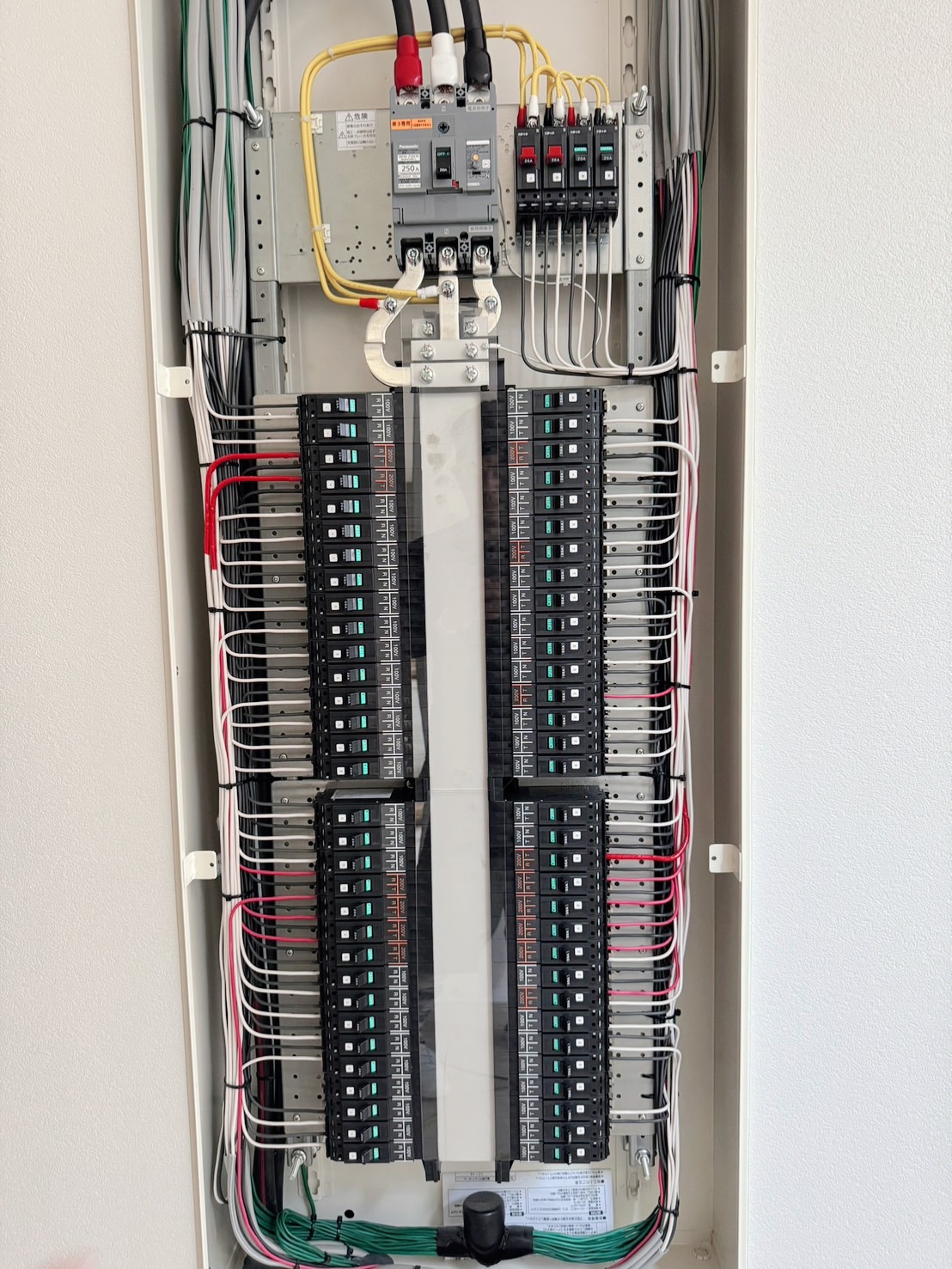 注文住宅の新築に合わせた電気設備一式を施工。キッチンの照明計画からコンセント・スイッチ配置まで、住み心地を重視した配線を実現。